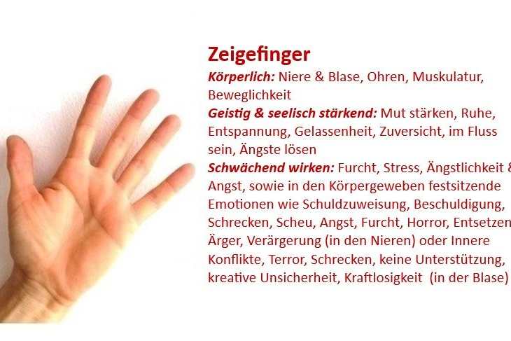 Weitere körperliche Zuordnungen: Zeigefinger(rechte Hand: aktuelle Zusammenhänge, linke Hand: Chronische Zustände, wie auch karmische & von den Ahnen übernommene Themen); Ohren; Muskulatur & Beweglichkeit.